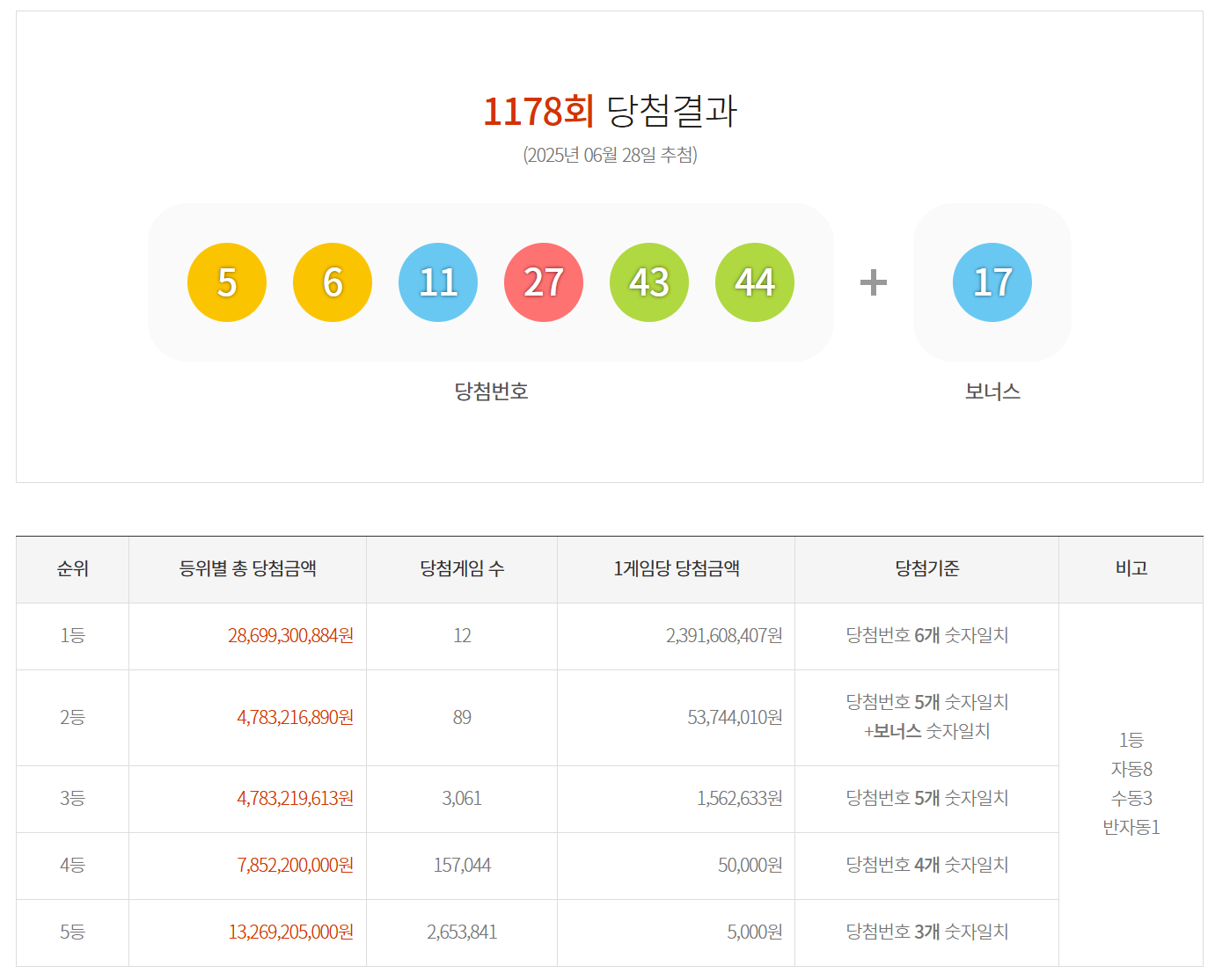| 1178회 | 5, 6, 11, 27, 43, 44 + 보너스 17 |